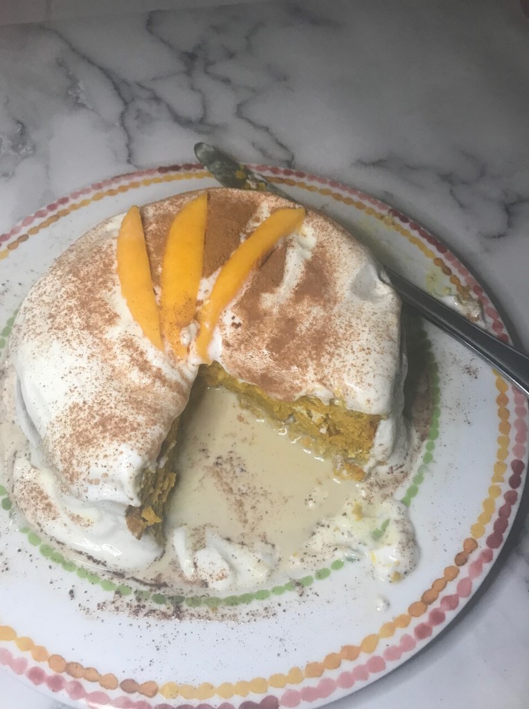 Here is a small tres leches – inspired cake with infused with Indian spices. It is a turmeric vanilla cake soaked overnight in a milk bath infused with cardamom and cinnamon. It is topped with whipped vanilla Greek yogurt and sliced mango.