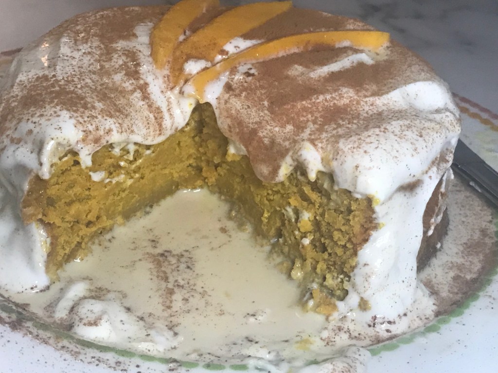 This cake is more dense than the traditional delicate tres leches sponge cake. It has an earthy turmeric flavor and is very yellow in color. The milk mixture is infused with cardamom and cinnamon. It is topped with whipped Greek yogurt instead of whipped cream and garnished with sliced mango instead of strawberries.