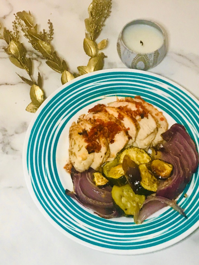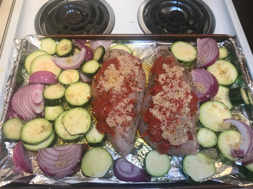 - Gently scatter zucchini and red onion around chicken breasts