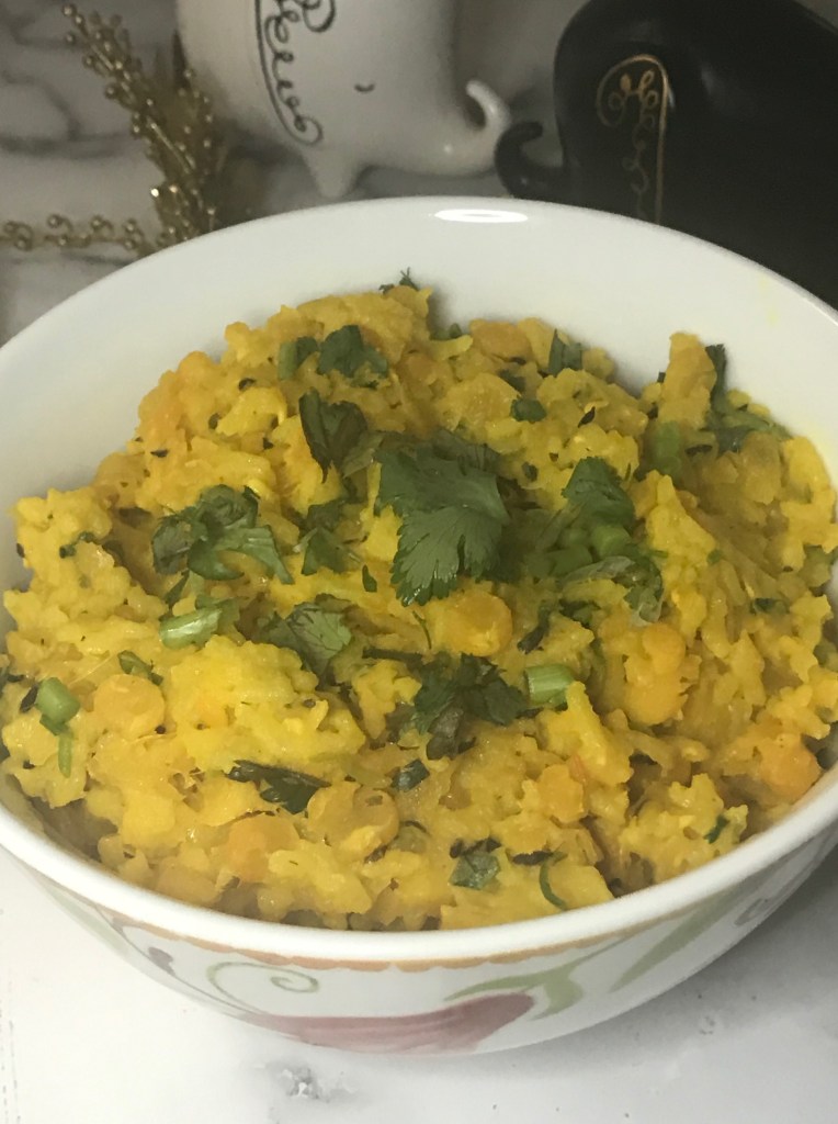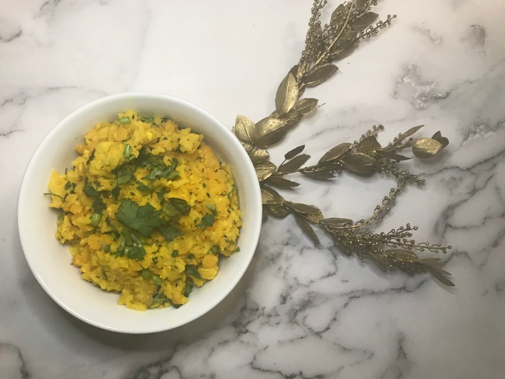 Kitchari is a popular rice dish that is a considered a comfort food in South Asian and throughout the Indian Diaspora. The rice is cooked with yellow split peas or moong daal, and infused with onion, garlic, turmeric, and toasted whole cumin. Kitchari has recently gained popularity because of its Ayurvedic origins.