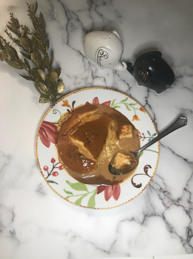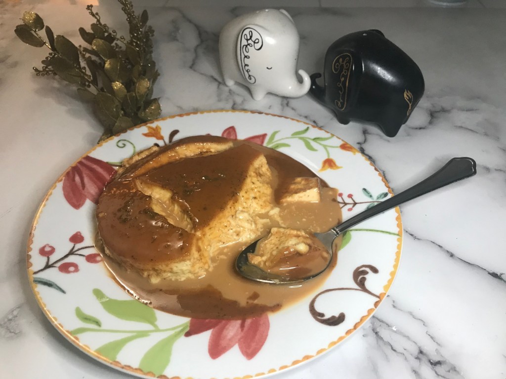 Flan is a rich and creamy custard covered in sweet caramel. It is a Latin American dessert often made with condensed milk and eggs. My version only uses half and half (single cream) and store-bought dulce de leche instead of caramel.